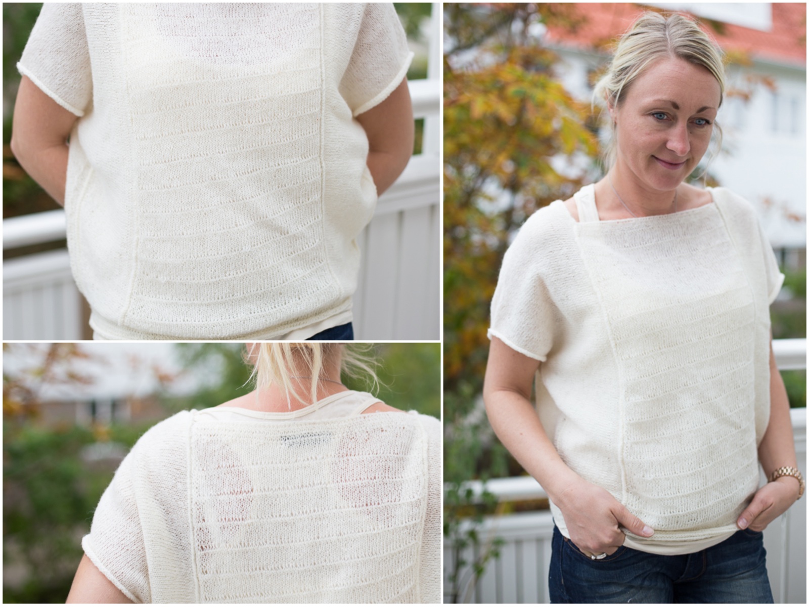 I dag ville jag iallafall visa er en tröja jag gjorde för ett tag sedan. Jag gillar den verkligen även att jag inte använder den så mycket! Kommer någon ihåg ett tidigare inlägg om min midsommarklänning? Den här tröjan kommer från samma bok. Jag älskar den boken! Om någon inte har sett den kan jag verkligen rekommendera boken ”Finstickat” av Helga Isager. (Den kan till exempel köpas här.) Den är full av fina bilder på snygga stickade kläder, de flesta i en lite annorlunda tappning än vad man brukar se stickade kläder. Dessutom är inte allt fokus på att det skall vara så enkelt, det här är stickning för den lite mer erfarna. I like! Garnet som används är Isagers egna, ett härligt tunt ullgarn som känns skönt mot kroppen.